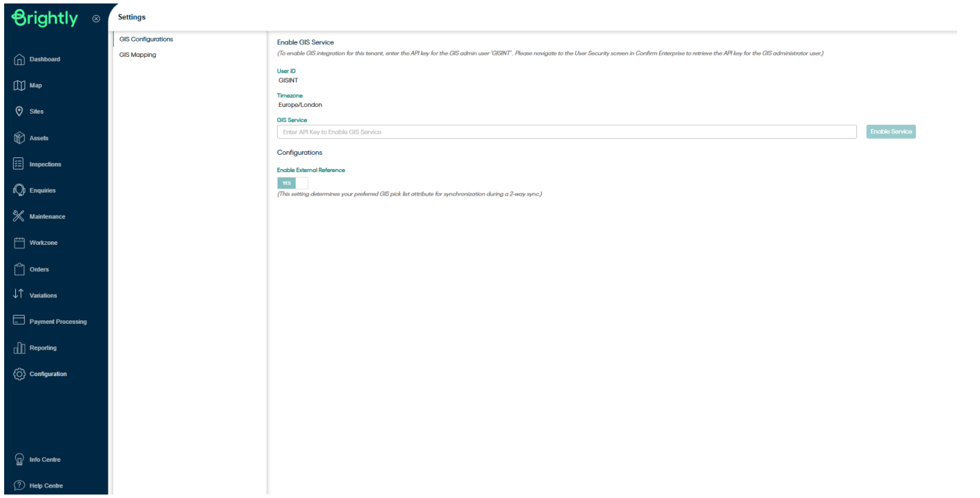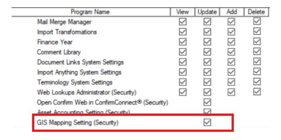 Once the tenant is enabled for GIS integration, the user needs to enable the security setting (GIS Mapping setting under Confirm User Security screen >> System Administration >> System configuration) to access the GIS mapping screen in Confirm Web interface.