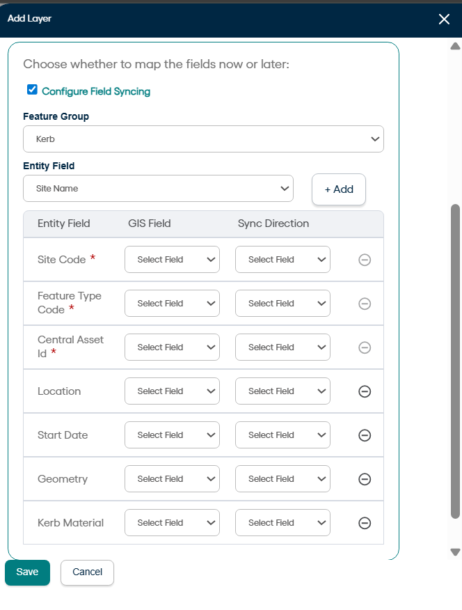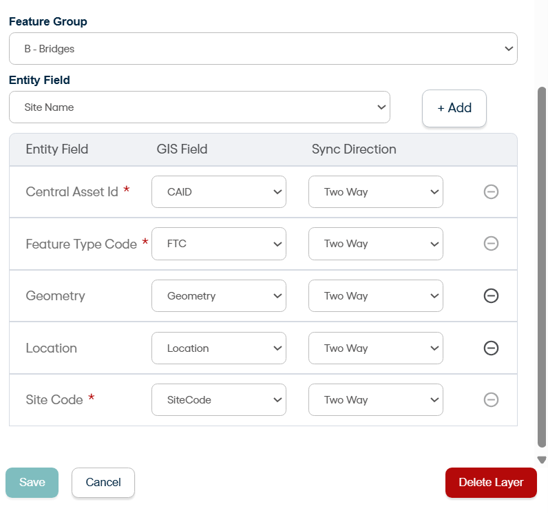 The user can select only one field at a time from Entity field dropdown. Select a field and click on Add. User can add several entity mappings one by one. Now select the relevant field (from Esri side) in GIS Field column and decide the sync direction.