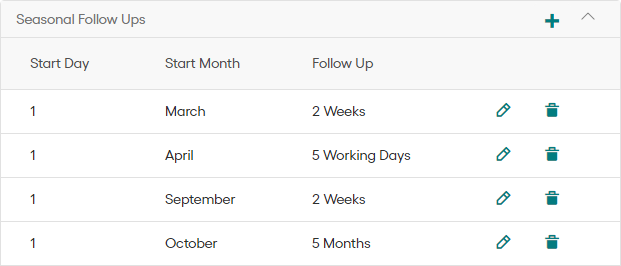 Seasonal Follow Ups apply from their Start Day/Month until superseded by the next Seasonal
